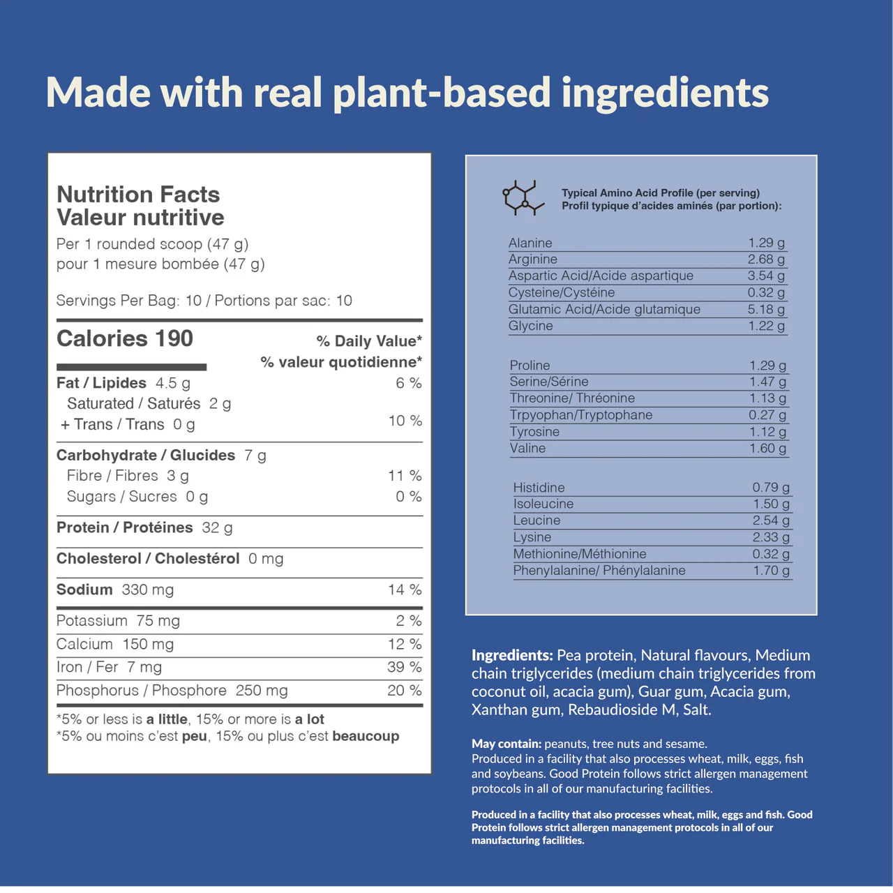 The Good Protein 32g High Protein Shake is your new post-workout recovery solution. Packed with 32g of protein and 5g of BCAAs, it’s made to support muscle growth and recovery. The protein source is pea protein, which naturally delivers a complete amino acid profile, including the branched-chain amino acids (BCAAs: leucine, isoleucine, valine). Formulated with MCTs to give you quick, sustained energy. Whether you're coming off a tough workout, training for your next race, or just want an extra protein boost, this smooth and creamy shake has your back. Containing no added sugar, it’s a vegan, keto, gluten-free, and non-GMO shake that fits effortlessly into a healthy lifestyle.
