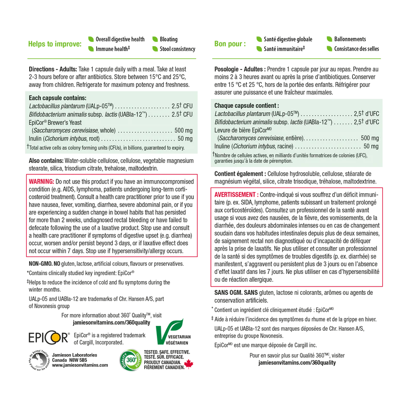 Jamieson Complete Gut Health is a unique 3-in-1 solution for digestive health; containing a clinically studied Postbiotic, Probiotics, and Inulin, a prebiotic fiber. Along with digestive support benefits, this advanced probiotic supports the immune system by reducing the incidence of cold and flu symptoms in the winter months