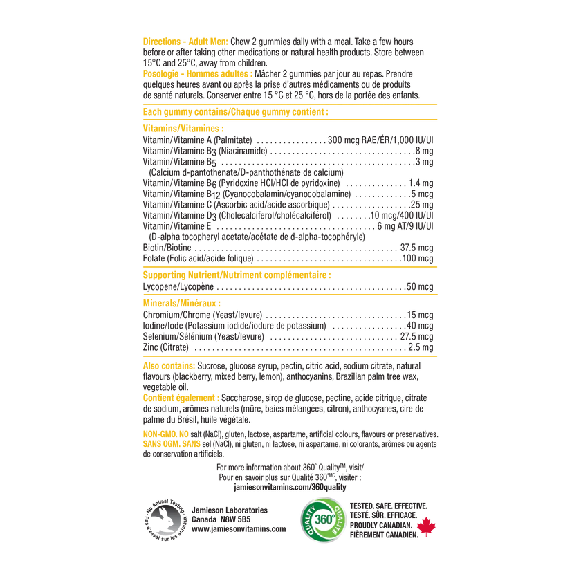Jamieson Men’s Multivitamin Gummies make daily nutrition simple and tasty. Expertly formulated with vitamins A, B, C, D, and E, these blackberry-lemon gummies support energy metabolism, immune health, strong bones, teeth, and eye health. With added vitamin C to boost collagen and connective tissue formation, they offer men a delicious, convenient way to maintain everyday wellness.