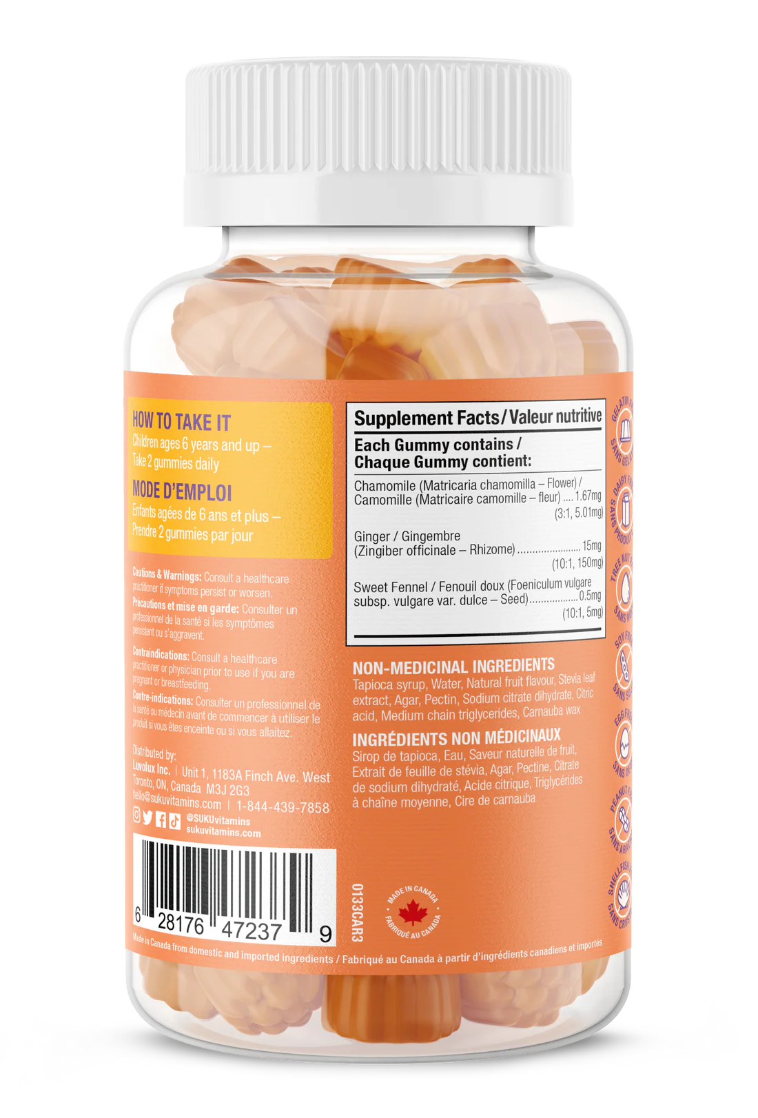 Non-medicinal Ingredients: Tapioca syrup, Water, Fruit flavour (Natural), Agar, Pectin, Citric acid, Sodium citrate dihydrate, Stevia leaf extract, Medium chain triglycerides, Carnauba wax